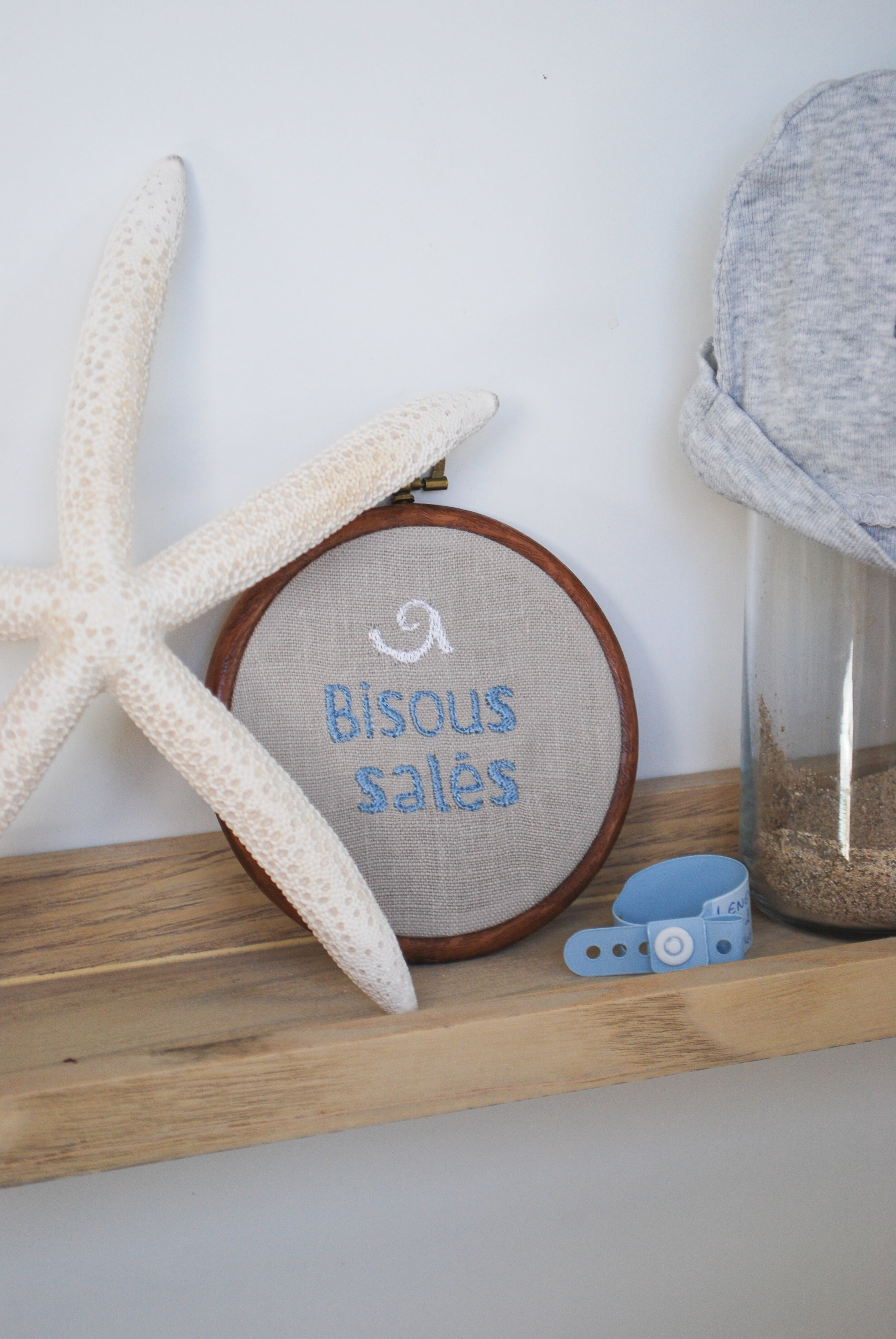 👉 Choisissez la police d’écriture, la couleur du fil, et ajoutez un symbole brodé si vous le souhaitez : cœur, coquillage, étoile de mer, soleil…